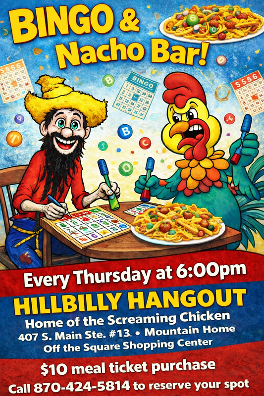 Bingo Night with Nacho Bar, $10 per person. Come have some fun and enjoy some great food. Please call, text, message or pay online to reserve your spot by Wednesday prior to that weeks game. Call 870-424-5814 for more info and to reserve your spot. You can also pay online http://sharpedgesaxethrowing.com/
